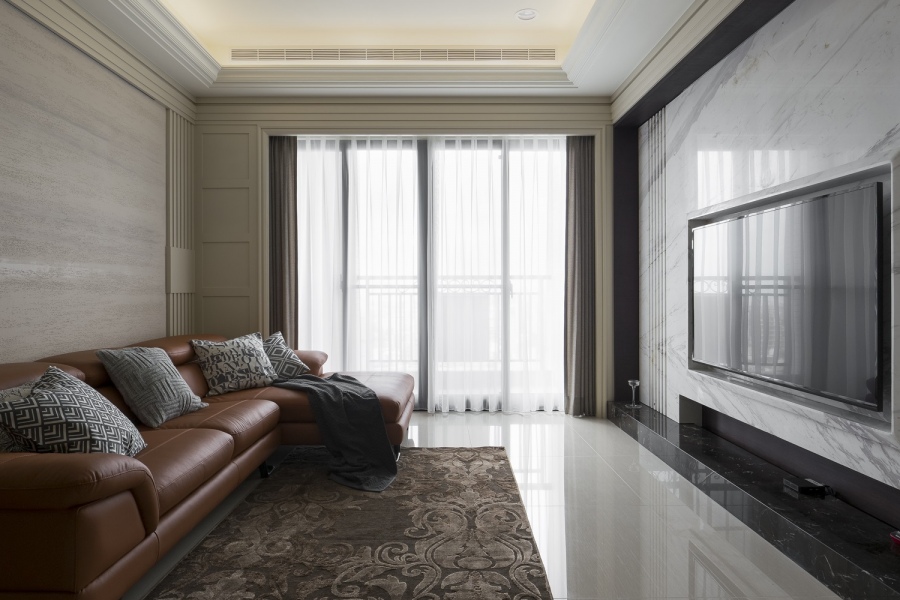 配色上以白色、米杏色為基底,清爽的配色搭配線板,呈現出優雅的古典氛圍,在局部搭配較重的色彩如電視底櫃、橘棕色的皮沙發,更是讓空間沉穩與活力並存,打造出業主心目中完美的舒適小窩。