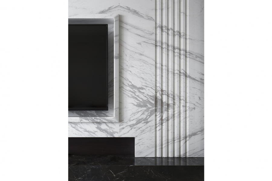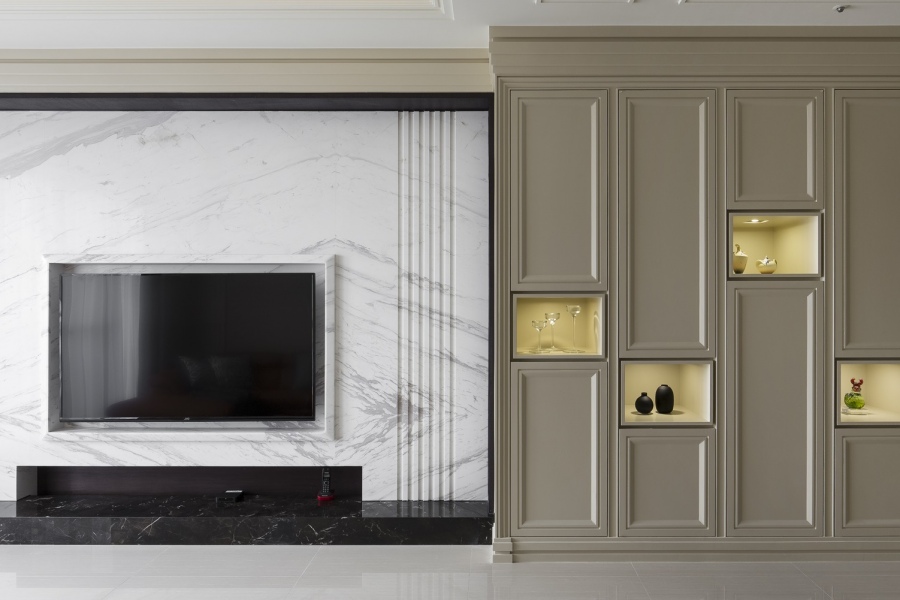 電視主牆面設計利用白色大理石紋路打造,下方搭配黑色大理石紋的平台,提供屋主放置機上盒、音響或相關配備,黑白分明的強烈對比打造俐落的線條,除此之外,為了避免大面積的電視牆過於單調,在兩側的牆面設計格柵狀的凹槽,增加了線條感,視覺上也更加豐富。