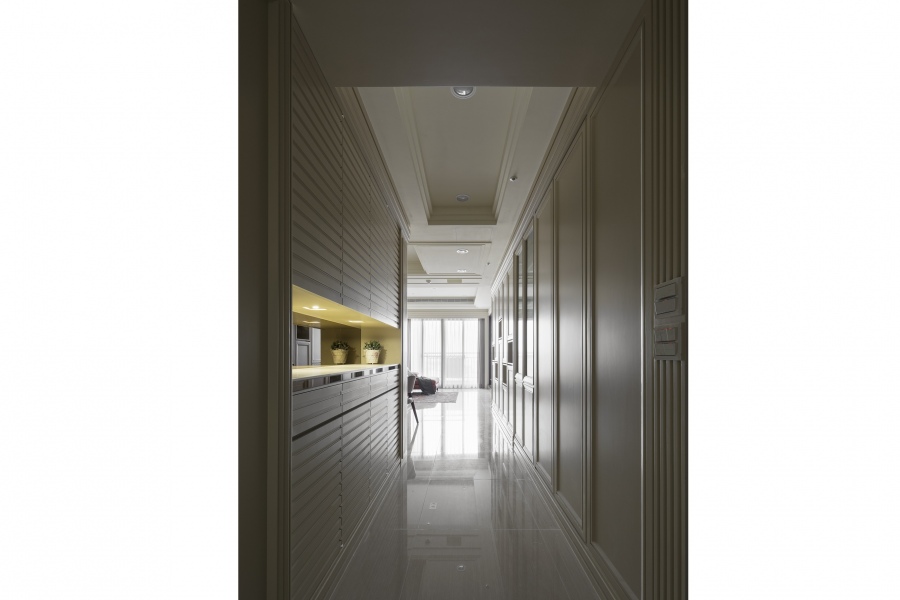 在玄關兩側皆規劃了收納櫃,其中進門左側的上下櫃門片是隔柵狀的造型,將美式風格的經典百葉窗元素融入,打造多樣的線條;中間鏤空的部分貼上鏡面,擴大狹窄走廊的空間效果,吊櫃底部裝設櫃下燈,除了在使用上能讓視線更舒適清晰,黃光也營造出了家的溫馨感。