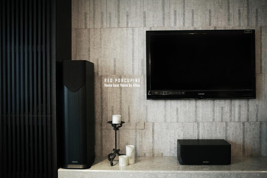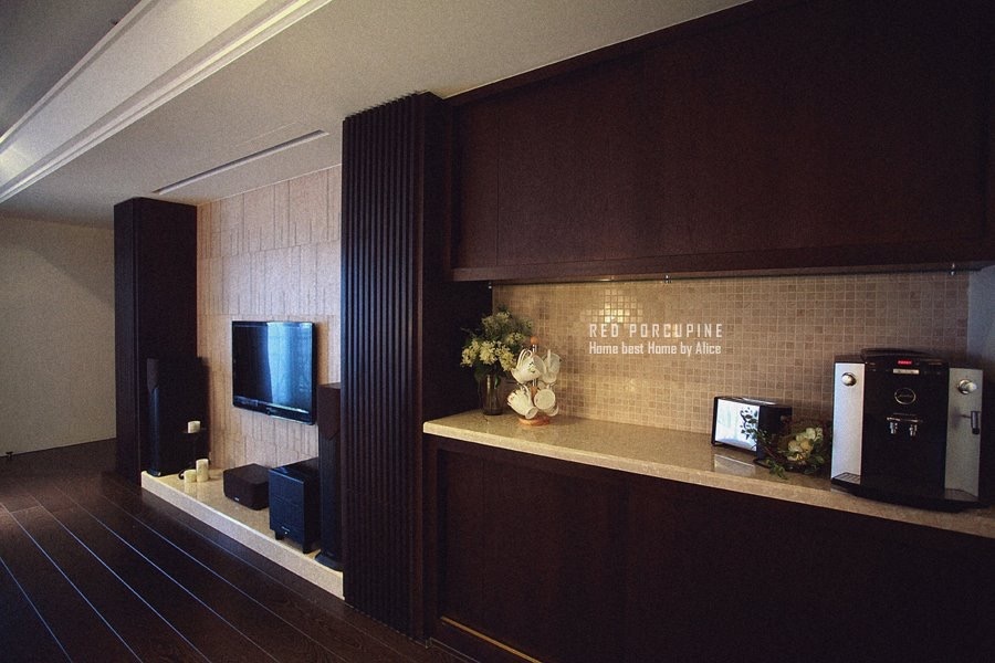 屋主喜歡深色調的居家風格,並且非常喜愛看電影,在空間設計上以暗色木頭搭配黑色,打造出有如影廳般的氛圍。大面積的深色能夠營造沉穩的空間感受,是現今少見的裝潢選擇,呈現出屋主獨樹一幟的風格品味。