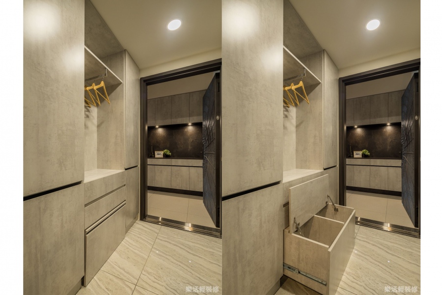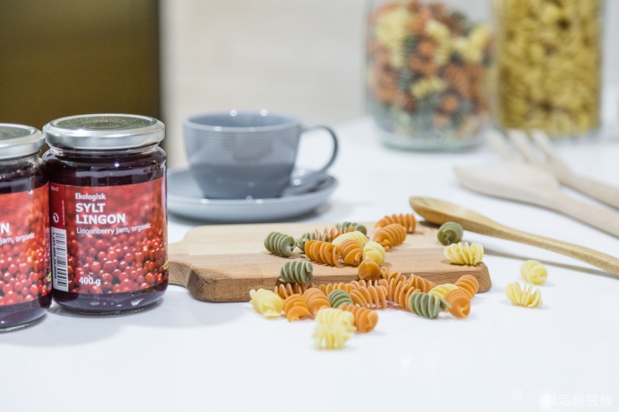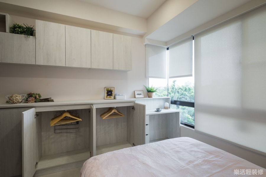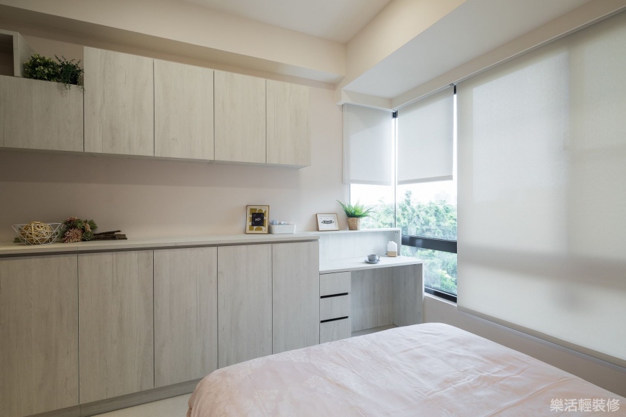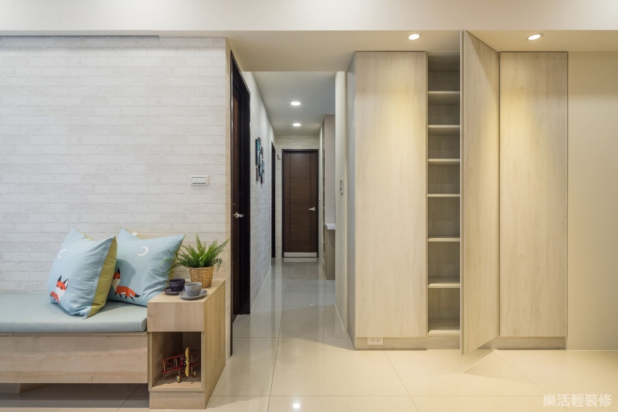 清新的淺色木紋能夠輕易地烘托出溫馨的氛圍,全室使用木紋打造櫃體,在客廳書櫃兼收納展示櫃和廚房吧檯使用跳色設計,其餘部分則使用同色的門片營造簡約的視覺感。