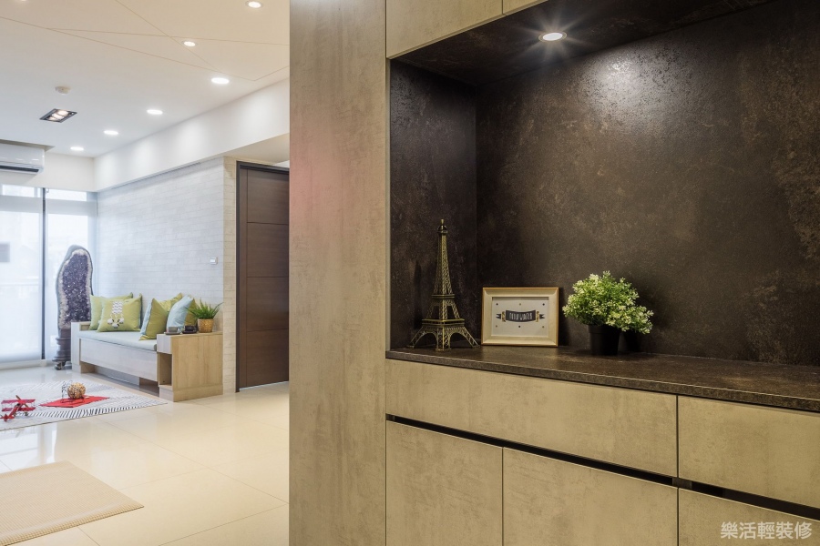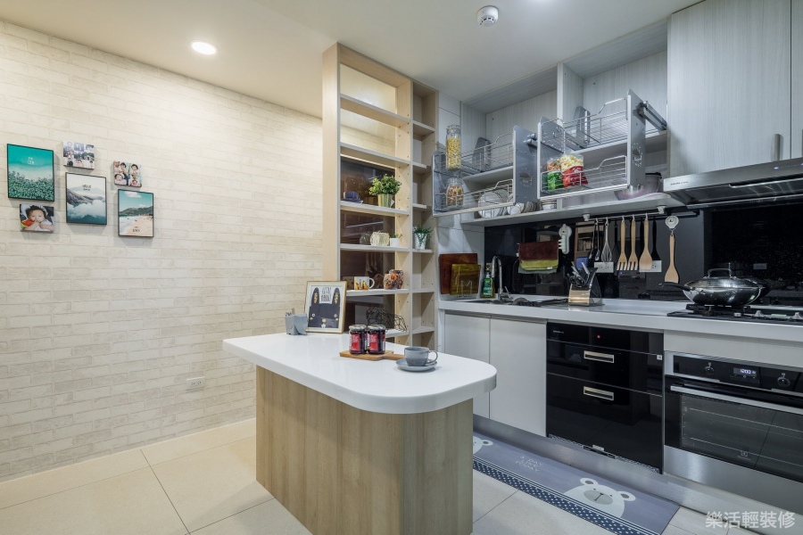 在客廳背牆和廚房使用造型磚牆,柔和色系的磚牆設計強調出溫馨的居家感受,讓人回到家就能夠輕易地放鬆下來。