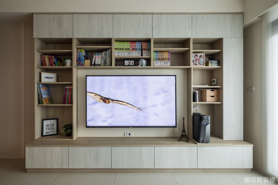 書牆也能作為設計的一部份,設計師將書櫃結合電視牆的展示收納櫃,讓一家大小能有更多時間一起待在客廳,更能增進家人之間的感情。將櫃體設計與樑同深,修飾了空間的線條,讓人感覺不出樑的存在。