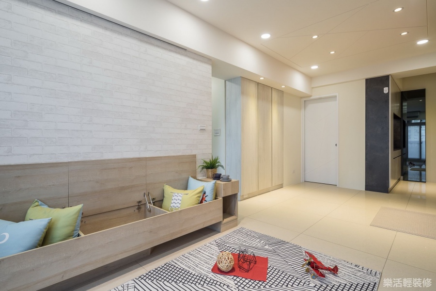 收納空間幾乎是每個家庭的共同議題,在空間的規劃上必須將空間利用最大化,才不會讓家裡滿滿的都是櫃子,造成視覺上的壓迫感。由於屋主不愛坐沙發,設計師用類似臥榻的形式來做客廳的座椅區,將椅子上的軟墊拿起來,就可以將門片上掀,底下又是能夠收納的空間。