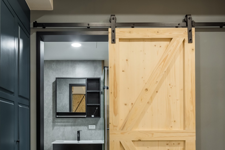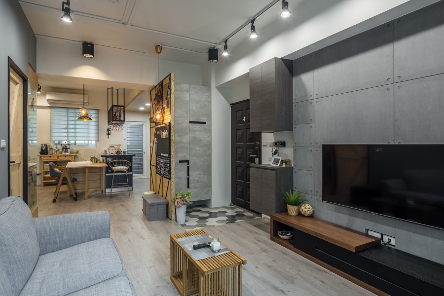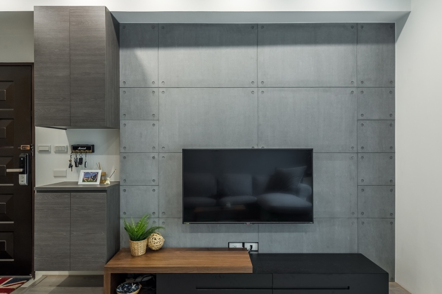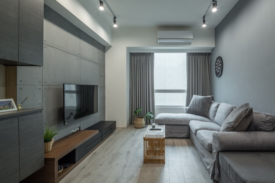 灰色是一種非常有彈性的顏色,放置在不同空間和不同的材質搭配,能創造出多樣的氛圍。而工業風較為經典的一面展露在客廳的區域,清水模質感的電視牆、冷咖灰色的玄關櫃、灰色的沙發背牆,同時也包含一些北歐風的元素,選擇淺色系的木地板、灰色調的布沙發和窗簾,軟化了冷硬的工業風線條,融合出獨特的居家風格。