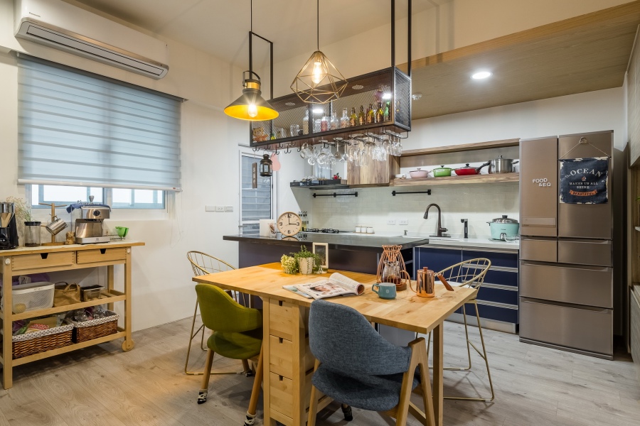 廚房和餐廳是屋主特別重視的區域,廚房選擇開放式設計,能夠讓多人一同備料、做菜,是一個非常適合小型聚會的空間。中島上的鐵件展示架可以擺放酒類和招待客人用的杯子,搭配可延伸的餐桌,讓客人人數較多時也能夠因應。廚櫃選用了海軍藍和蘋果木紋路板材,營造出率性又溫馨的氛圍。