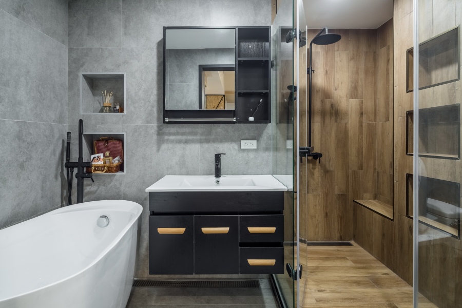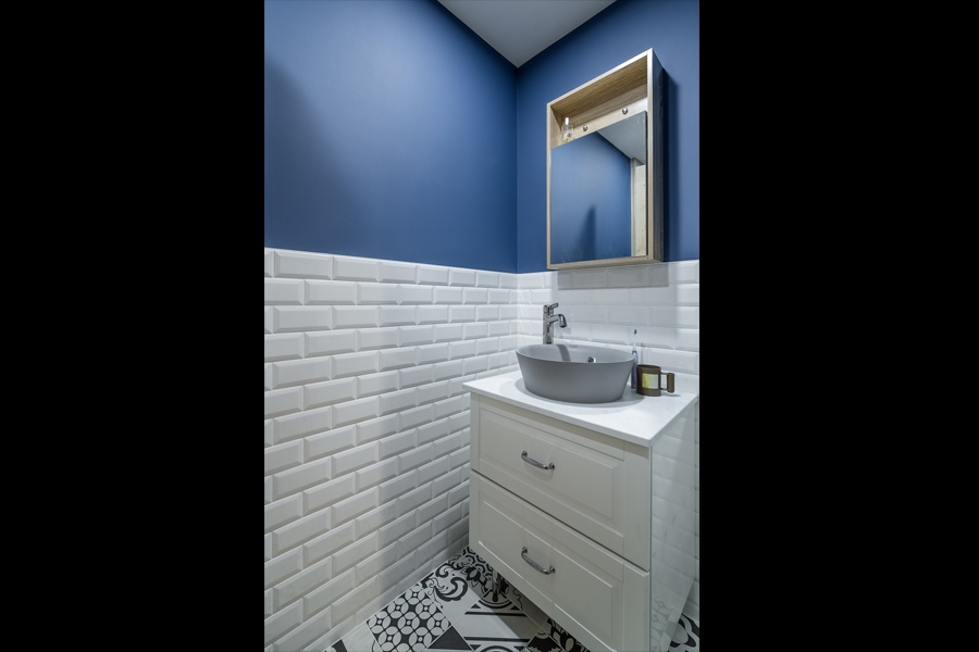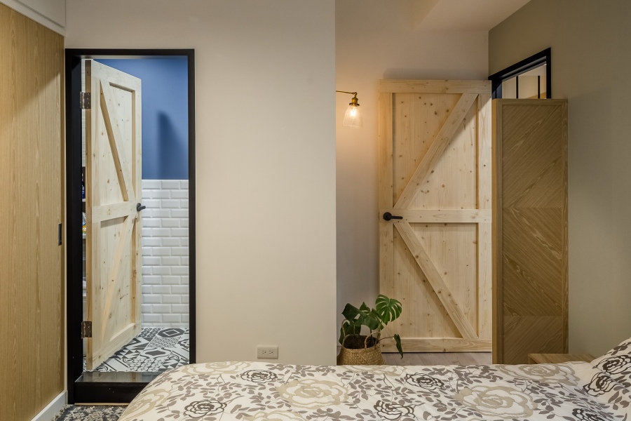 衛浴空間特別選了全黑的衛浴設備,搭配木紋磚與灰色大片磚,呈現出來的強烈效果令人眼睛一亮!主臥的廁所則是選用藍色壁面與巧克力磚,加上充滿童趣的地板花磚,配上獨特少見的灰色面盆,小空間也能透出許多亮點。