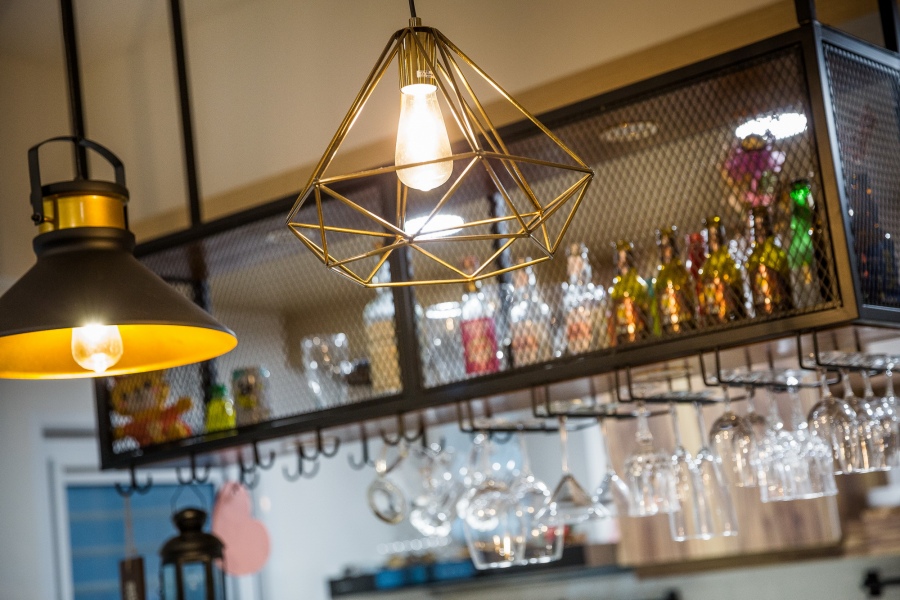 鐵件、金屬是工業風裡常見的元素,例如選用鐵製網格架作為展示牆的配件,餐桌上的主燈選擇兩種不同設計的金屬吊燈,更能展現出美式小酒館的隨興氣息。