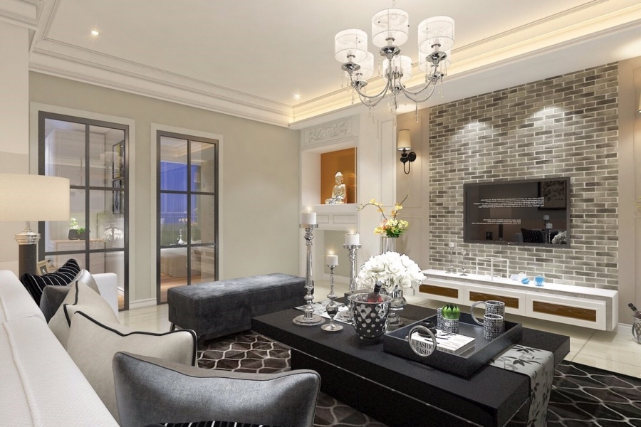 空間元素:線板 x 文化石牆 x 各式造型燈具