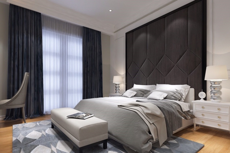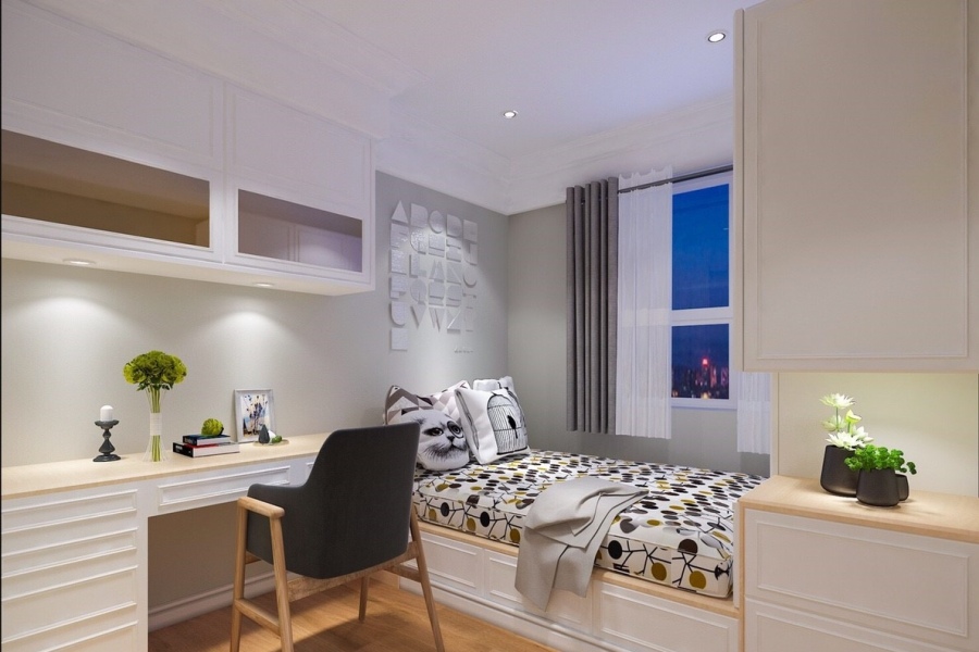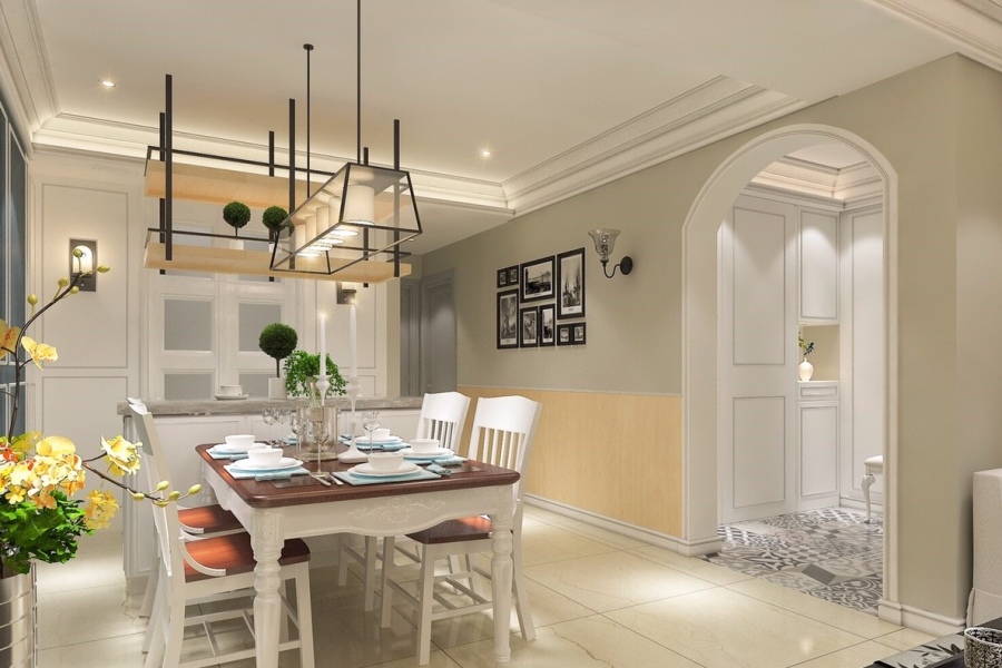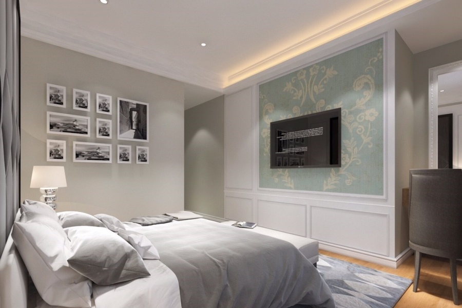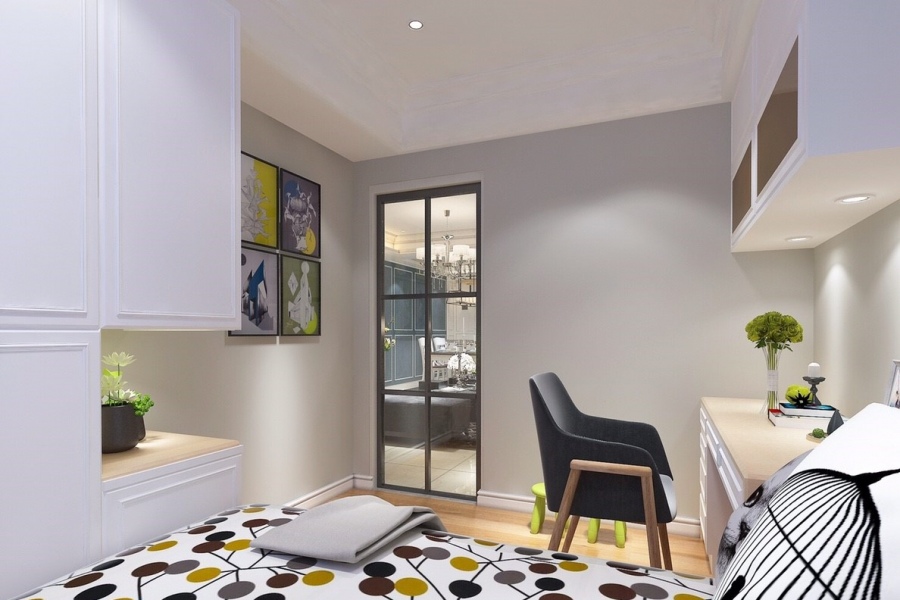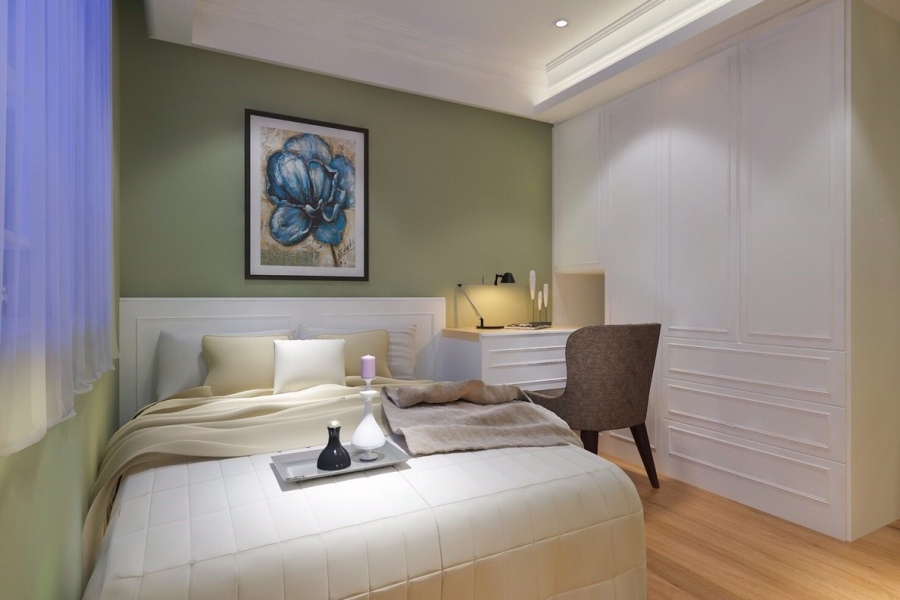線板是美式鄉村風的經典元素,可以看到設計師利用線板作為天花板邊緣的裝飾,也能在櫃子的門片上看見線板的蹤影。相較於公共空間使用較多的材質和線條,臥室等私領域則僅以單一色系搭配線板打造個人風格,烘托出簡約溫馨的居住感受。